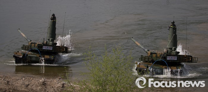 (여주=포커스뉴스) 19일 오전 경기도 여주시 남한강 일대에서 육군 20사단이 K-2 흑표전차 잠수도하훈련을 하고 있다. K-2흑표전차는 최고 4.1m수심의 하천을 문교나 부교없이 독자적으로 건널 수 있다.