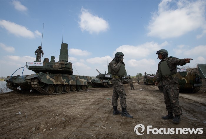 (여주=포커스뉴스) 19일 오전 경기도 여주시 남한강 일대에서 육군 20사단이 K-2 흑표전차 잠수도하훈련을 하고 있다. K-2흑표전차는 최고 4.1m수심의 하천을 문교나 부교없이 독자적으로 건널 수 있다.