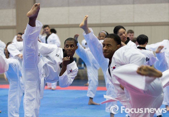 (서울=포커스뉴스) 19일 오후 서울 용산구 국방부 다목적홀에서 한국문화 체험행사에 참가한 주한미군 장병들이 태권도를 배우고 있다.