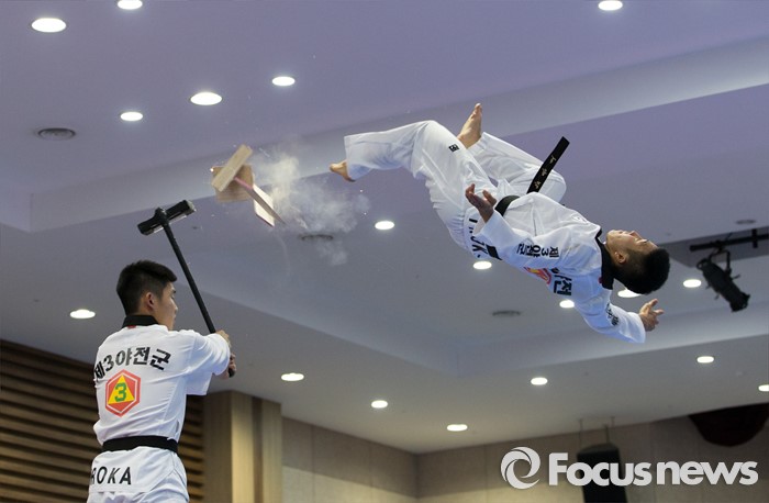 (서울=포커스뉴스) 19일 오후 서울 용산구 국방부 다목적홀에서 국방부 태권도 시범단이 한국문화 체험행사에 참가한 주한미군 장병들에게 시범을 선보이고 있다.