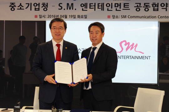 중소기업청(이하 중기청)과 SM엔터테인먼트(이하 SM엔터)는 19일 서울 삼성동 SM엔터 본사에서 '한류활용 중소·중견기업 수출 경쟁력 강화를 위한 공동협약'을 체결했다.