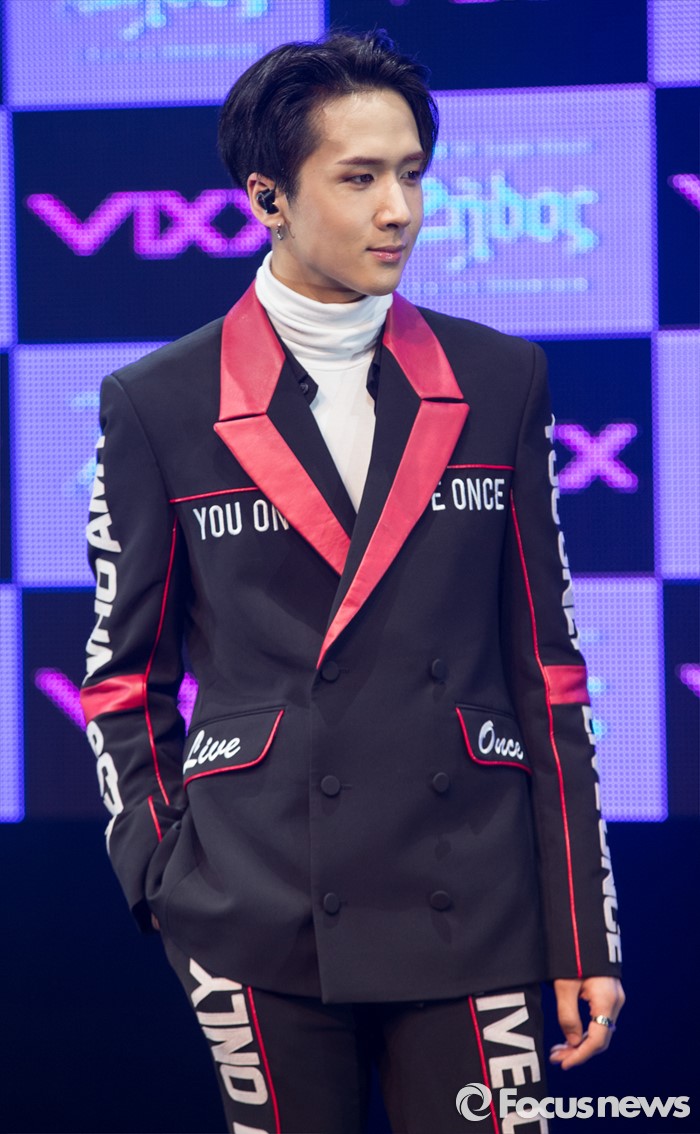 홀서울=포커스뉴스) 19일 오후 서울 마포구 롯데카드 아트센터에서 열린 아이돌그룹 VIXX의 싱글앨범 'Zelos' 발표 쇼케이스에 참여한 멤버 라비가 포토타임을 갖고 있다.