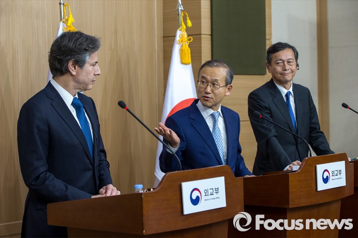 (서울=포커스뉴스) 임성남 외교부 제1차관이 19일 오후 서울 종로구 외교부에서 '제3차 한미일 외교차관 협의회' 결과 발표를 마친 뒤 토니 블링컨 미국 국무부 부장관에게 발언을 권하고 있다.