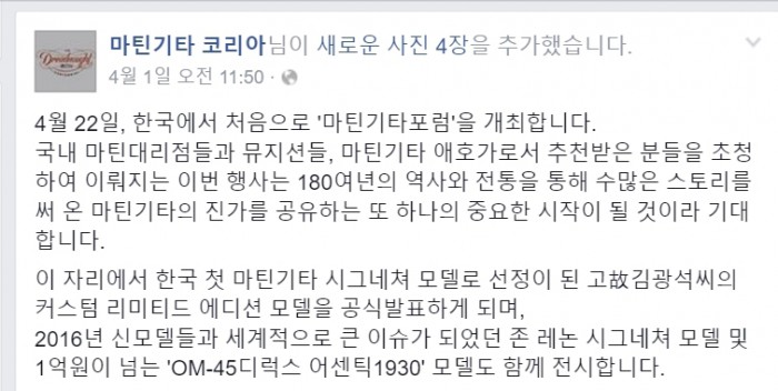 마틴기타 코리아가 지난 1일 공식 소셜네트워크서비스(SNS)를 통해 행사 개최 사실을 공지한 사실이 뒤늦게 알려졌다. 지난 1일 오전 11시50분 마틴기타 코리아가 게시한 내용은 "오는 22일 한국에서 처음으로 마틴기타포럼을 개최한다. 이 자리에서 한국 첫 마틴기타 시그니처 모델로 선정이 된 고(故) 김광석 씨의 커스텀 리미티드 에디션 모델을 공식 발표하게 된다"라는 소식이다.
