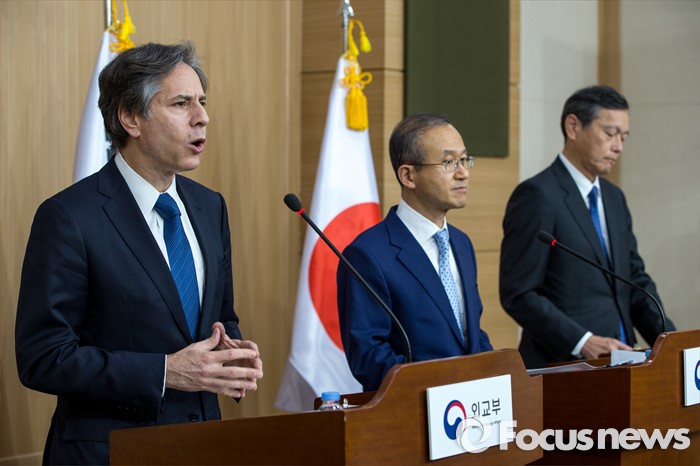(서울=포커스뉴스) 토니 블링컨 미국 국무부 부장관이 19일 오후 서울 종로구 외교부에서 '제3차 한미일 외교차관 협의회' 결과 발표를 하고 있다.