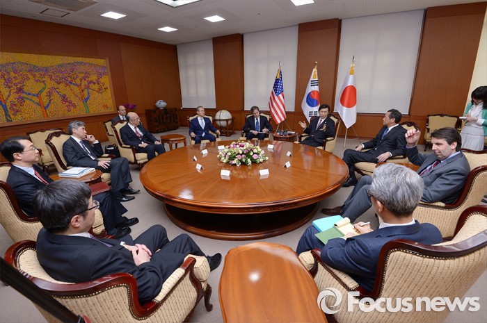 (서울=포커스뉴스) 윤병세 외교부 장관이 19일 오후 서울 종로구 외교부에서 열린 한미일 외교차관 접견에서 사이키 아키타카 일본 외무성 사무차관과 대화를 나누고 있다.