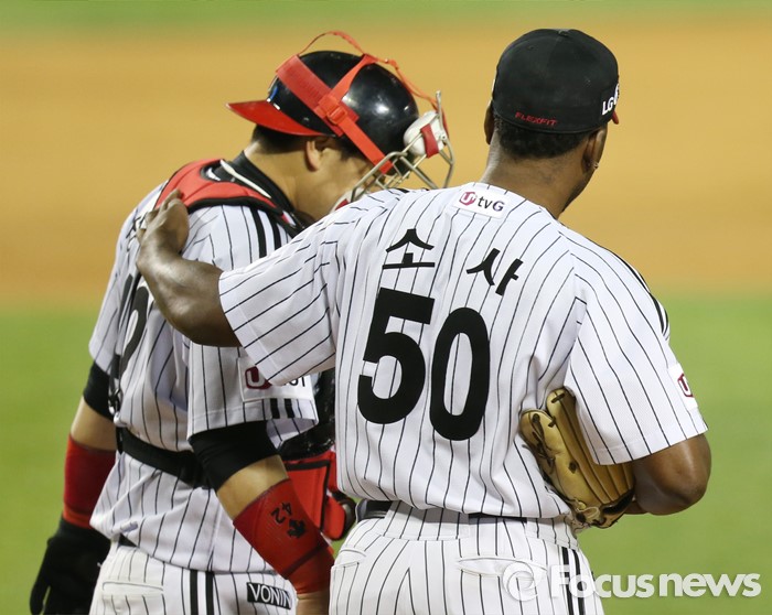 (서울=포커스뉴스) 19일 서울 잠실구장에서 열린 2016 프로야구 NC-LG 경기 4회초 1사 1,2루에서 LG 포수 정상호가볼을 빠트려 주자를 1베이스씩 진루시키자 소사가 정상호와 대화하고 있다.