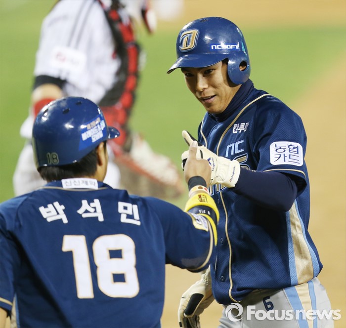 (서울=포커스뉴스) 19일 서울 잠실구장에서 열린 2016 프로야구 NC-LG 경기 8회초 1사 만루에서 NC 지석훈의 유격수앞 땅볼때 3루주자 박석민과 2루주자 황윤호가 홈인한후 엄지손가락을 마주치고 있다.