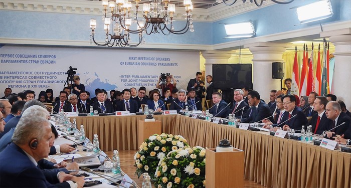 (서울=포커스뉴스) 정의화 국회의장이 19일 오전(현지시각) 러시아 모스크바 래디슨 로얄 호텔에서 열린 1차 유라시아 국회의장회의에 참석해 21세기 유라시아 국가의 공동 번영을 위한 의회 간 협력을 주제로 개회사를 하고 있다. <사진제공=국회>