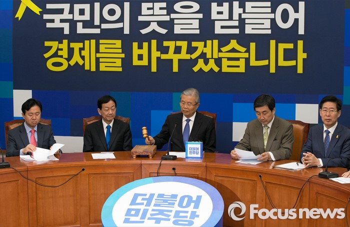 마지막으로 결의문을 채택하고 낭독을 한 후 전원이 국회 귀빈식당에서 오찬을 이어간다.김종인(왼쪽 세번째) 더불어민주당 비대위 대표가 18일 오전 서울 여의도 국회에서 비상대책위원회의에 참석해 개의 선언을 하고 있다. 2016.04.18 박동욱 기자