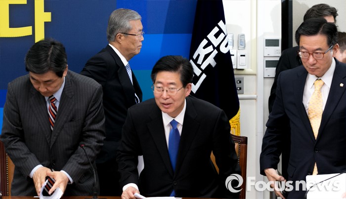 (서울=포커스뉴스) 김종인 더불어민주당 비대위 대표가 20일 오전 서울 여의도 국회에서 비상대책위원회의를 마친 뒤 퇴장하고 있다. 왼쪽부터 이종걸 원내대표, 김 대표, 양승조, 정성호 비대위원.