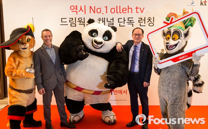 (서울=포커스뉴스) 20일 오전 서울 중구 그랜드 앰버서더 호텔에서 열린 '올레tv 드림웍스 채널 출시' 기자간담회에 참석한 에릭 엘렌보겐(왼쪽) 드림웍스 해외TV사업 대표와 강국현 KT 마케팅본부장이 드림웍스 매니메이션 캐릭터 인형옷을 입은 모델들과 함께 포즈를 취하고 있다.