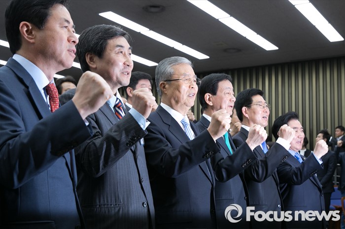 (서울=포커스뉴스) 김종인(왼쪽 세번째) 더불어민주당 비상대책위 대표와 이종걸(왼쪽 두번째) 원내대표를 비롯한 제20대 국회의원 선거 당선자들이 20일 오전 서울 여의도 국회에서 열린 제20대 국회 당전자 대회에 참석해, 화이팅을 외치고 있다.