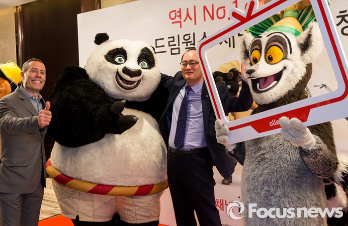 (서울=포커스뉴스) 20일 오전 서울 중구 그랜드 앰버서더 호텔에서 열린 '올레tv 드림웍스 채널 출시' 기자간담회에 참석한 에릭 엘렌보겐(왼쪽) 드림웍스 해외TV사업 대표와 강국현 KT 마케팅본부장이 드림웍스 매니메이션 캐릭터 인형옷을 입은 모델들과 함께 포즈를 취하고 있다.