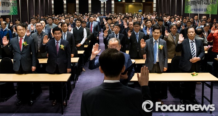(서울=포커스뉴스) 20일 오후 서울 송파구 교통회관에서 택시노사 4개 단체 및 택시업계 종사자들이 교통안전 향상 결의문 선서를 하고 있다.