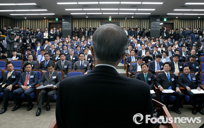| △ 김종인 인사말 듣는 더민주 당선인들 |