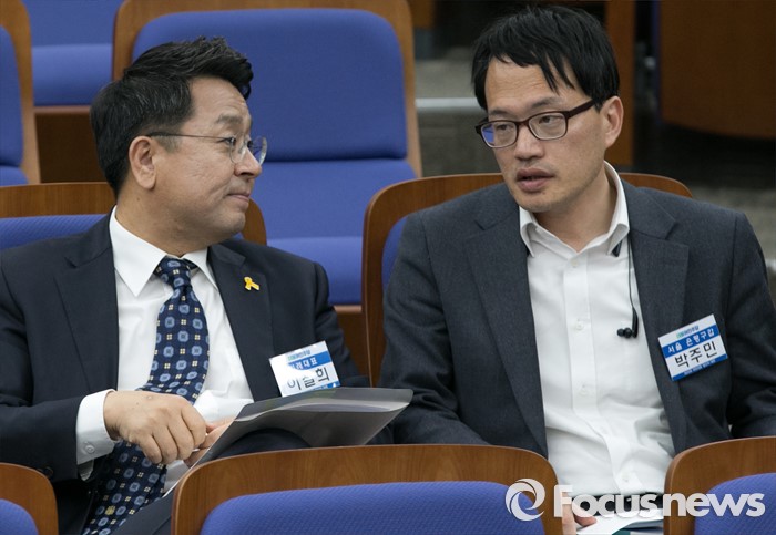 (서울=포커스뉴스) 20일 오전 서울 여의도 국회에서 열린 더불어민주당 20대 총선 당선자 대회에 참석한 이철희(왼쪽), 박주민 당선인이 대화하고 있다.