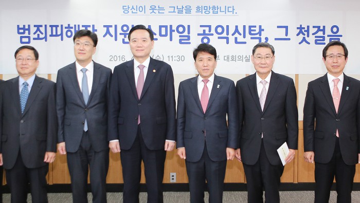 (서울=포커스뉴스) KEB하나은행은 20일 법무부와 '범죄피해자 지원 스마일 공익신탁' 출범식을 갖고 김현웅 법무부 장관과 법무부 직원들로부터 제1호 신탁을 받았다고 밝혔다.