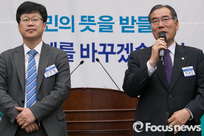 (서울=포커스뉴스) 20일 오전 서울 여의도 국회에서 열린 더불어민주당 20대 총선 당선자 대회에 참석한 전남 및 전북 지역에서 당선한 이개호(오른쪽), 안호영 당선인이 인사말을 하고 있다.