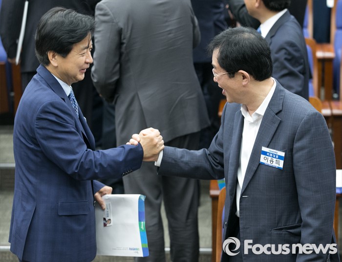 (서울=포커스뉴스) 20일 오전 서울 여의도 국회에서 열린 더불어민주당 20대 총선 당선자 대회에 참석한 노웅래(왼쪽), 이용득 당선인이 인사하고 있다.