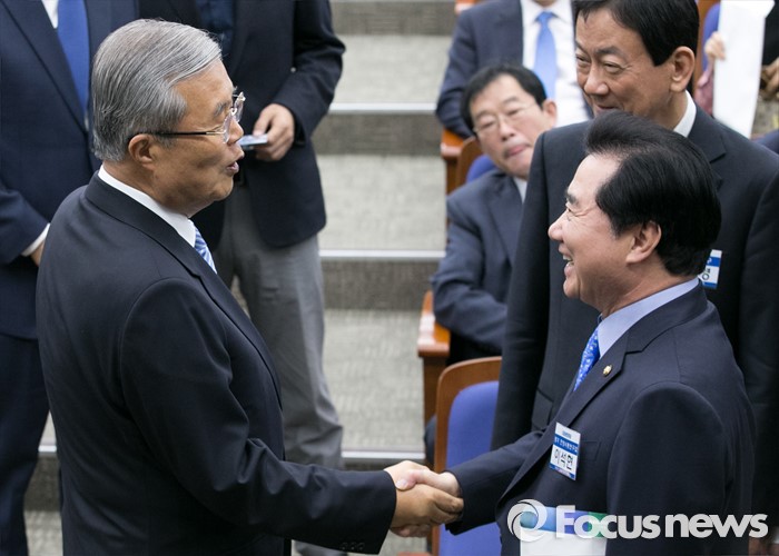 (서울=포커스뉴스) 20일 오전 서울 여의도 국회에서 열린 더불어민주당 20대 총선 당선자 대회에 참석한 김종인(왼쪽) 비대위 대표와 이석현 당선인이 인사하고 있다.