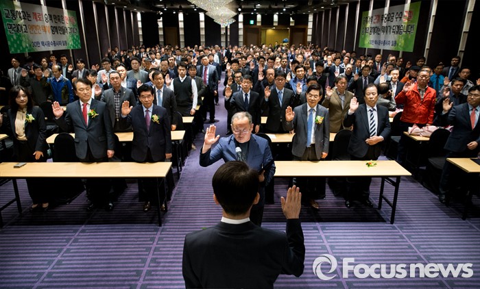 (서울=포커스뉴스) 20일 오후 서울 송파구 교통회관에서 택시노사 4개 단체 및 택시업계 종사자들이 교통안전 향상 결의문 선서를 하고 있다.