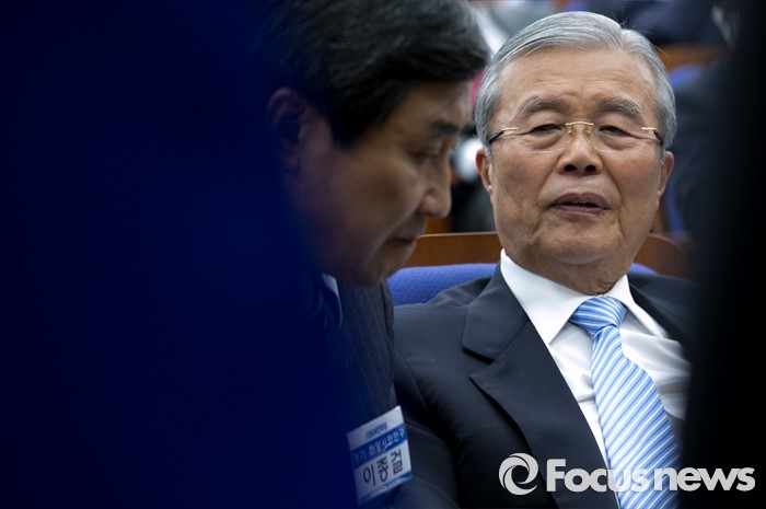 (서울=포커스뉴스) 20일 오전 서울 여의도 국회에서 열린 더불어민주당 20대 총선 당선자 대회에 참석한 김종인(오른쪽) 비대위 대표와 이종걸 원내대표가 대화하고 있다.