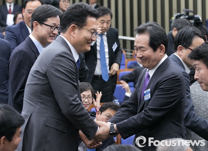 (서울=포커스뉴스) 20일 오전 서울 여의도 국회에서 열린 더불어민주당 20대 총선 당선자 대회에 참석한 송영길(왼쪽), 정세균 당선인이 인사하고 있다.
