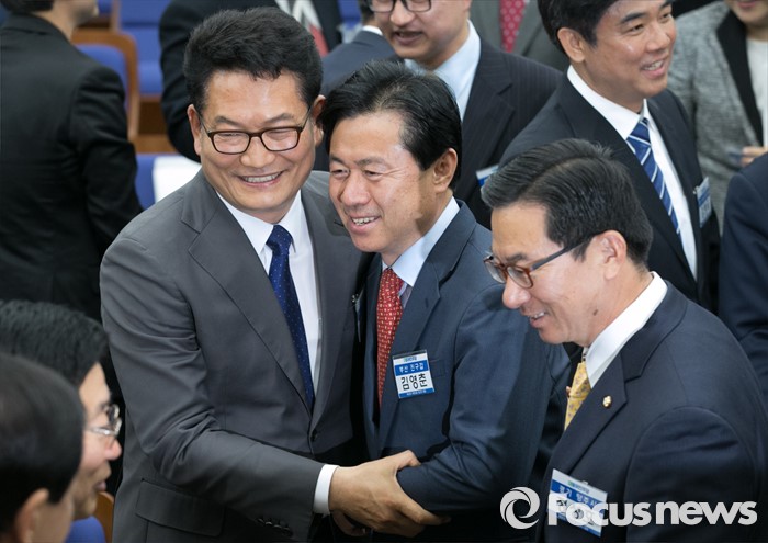 (서울=포커스뉴스) 20일 오전 서울 여의도 국회에서 열린 더불어민주당 20대 총선 당선자 대회에 참석한 송영길(왼쪽), 김영춘(가운데) 당선인이 인사하고 있다. 오른쪽은 정성호 당선인.