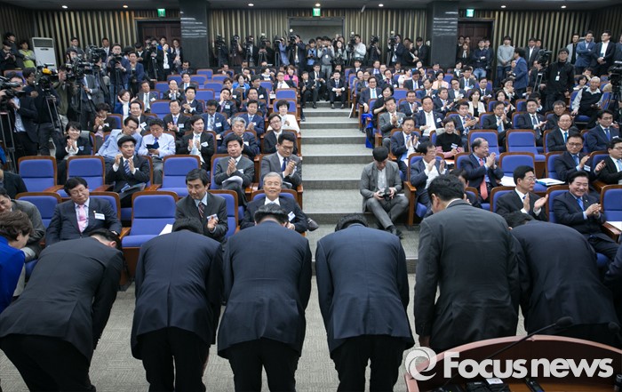 (서울=포커스뉴스) 20일 오전 서울 여의도 국회에서 열린 더불어민주당 20대 총선 당선자 대회에 참석한 경기도 지역 당선인들이 인사말을 마친 뒤 인사하고 있다.