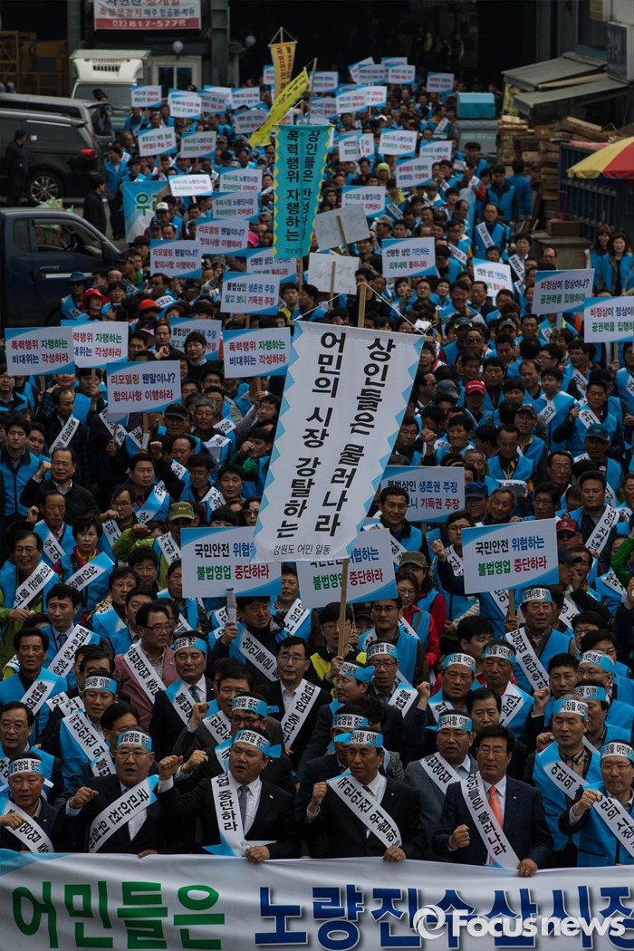 (서울=포커스뉴스) 노량진수산시장 현대화 사업으로 상인들과 수협 간 갈등이 고조되고 있는 20일 오후 서울 영등포구 노량진수산시장에서 전국 어민 2000여 명이 시장 정상화를 촉구하는 총궐기 대회를 열고 있다.
