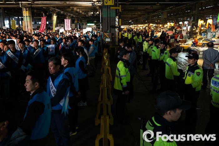 (서울=포커스뉴스) 노량진수산시장 현대화 사업으로 상인들과 수협 간 갈등이 고조되고 있는 20일 오후 서울 영등포구 노량진수산시장에서 전국 어민 2000여 명이 시장 정상화를 촉구하는 총궐기 대회를 열고 있다.