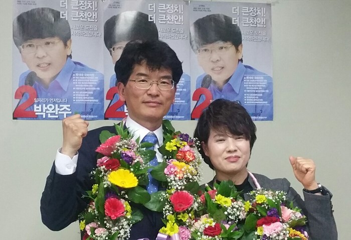 이어 "20년 전부터 쭉 보면 역대 충청권 승리 후보가 대권을 잡는 패턴이 있다"며 "20대 총선이 끝이아니고 내년이 정권교체의 마지막 (기회)"이라고 강조했다.20대 총선 당선이 확정된 박완주 더불어민주당 충남 천안을 후보 부부가 13일 오후 충남 천안 자신의 선거캠프에서 포즈를 취하고 있다. <사진제공=박완주 후보 선거사무소> 2016.04.13 포커스포토