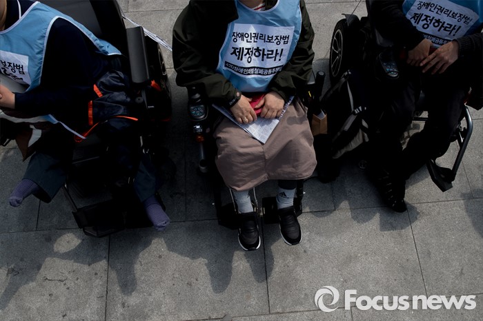 (서울=포커스뉴스) 20일 오후 서울 광화문 광장에서 420장애인차별철폐연대 공동투쟁단 단원들이 '420장애인차별철폐 투쟁결의대회'를 하고 있다.