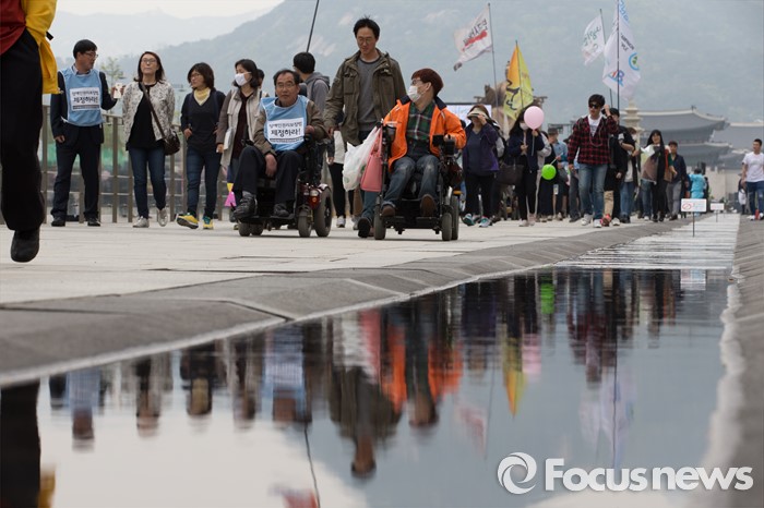 (서울=포커스뉴스) 20일 오후 서울 광화문 광장에서 420장애인차별철폐연대 공동투쟁단 단원들이 '420장애인차별철폐 투쟁결의대회'를 마치고 행진을 하고 있다.