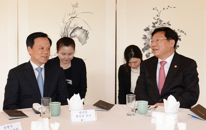 (서울=포커스뉴스) 주형환 산업통상자원부 장관이 20일 오전 서울 성북구 삼청각에서 천민얼(陳敏尒) 중국 귀주성 당서기와의 면담을 갖고, 한중 자유무역협정(FTA) 시대 통상투자 협력강화 및 산업협력 증진 방안에 관해 의견을 교환하고 있다. <사진제공=산업통상자원부>