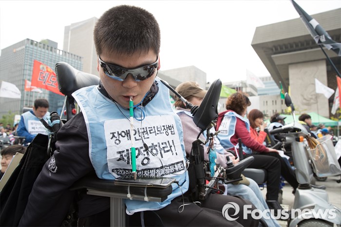 (서울=포커스뉴스) 20일 오후 서울 광화문 광장에서 420장애인차별철폐연대 공동투쟁단 단원들이 '420장애인차별철폐 투쟁결의대회'를 하고 있다.