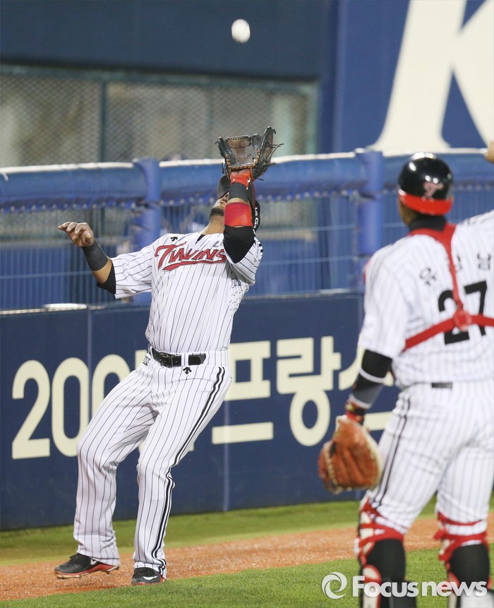 (서울=포커스뉴스) 20일 서울 잠실구장에서 열린 2016 프로야구 NC-LG 경기 6회초 무사 1루에서 LG 3루수 히메네스가 NC 불펜 앞에서 박석민의 파울플라이볼을 잡고 있다.