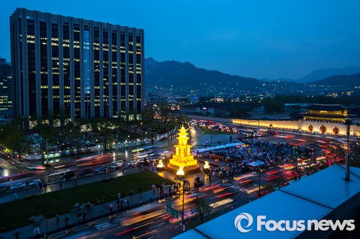 (서울=포커스뉴스) 20일 오후 서울 종로구 광화문 광장에서 부처님오신날(5월 14일)을 앞두고 봉축행사의 일환인 '사사자 삼층석탑등 점등식'이 열리고 있다.