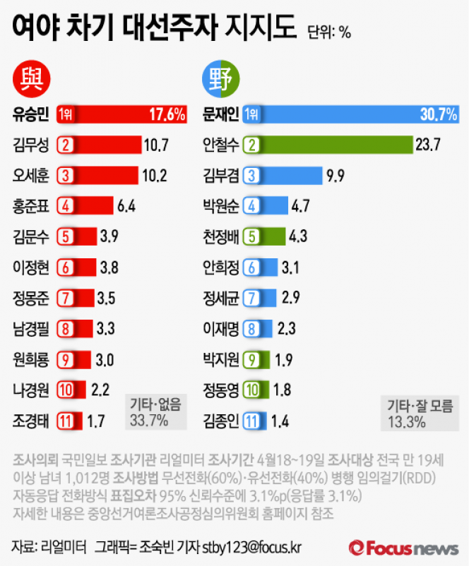 (서울=포커스뉴스) 국민일보가 의뢰해 리얼미터가 4월18~19일에 실시한 여권·야권 차기 대선주자 지지도 조사에서, 여권에선 유승민 전 새누리당 원내대표가 김무성 새누리당 전 대표를 제치고 1위를 차지한 것으로 나타났다.