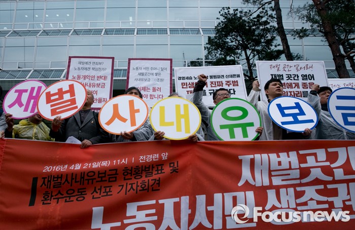 (서울=포커스뉴스) 21일 오전 서울 여의도 전경련회관에서 재벌사내유보금환수운동본부 등 관련단체 회원들이 재벌사내유보금 현황발표 및 환수운동 선포 기자회견을 하고 있다.