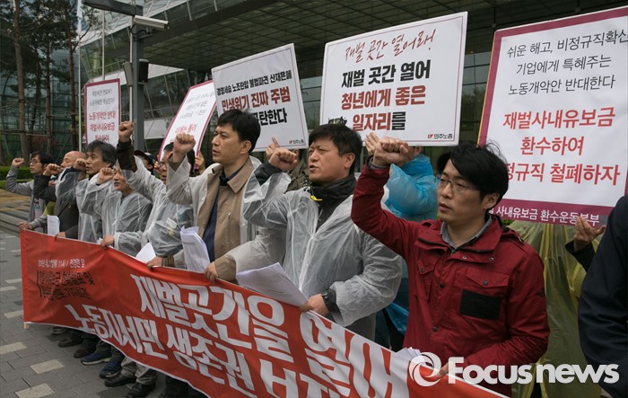 (서울=포커스뉴스) 21일 오전 서울 여의도 전경련회관에서 재벌사내유보금환수운동본부 등 관련단체 회원들이 재벌사내유보금 현황발표 및 환수운동 선포 기자회견을 하고 있다.