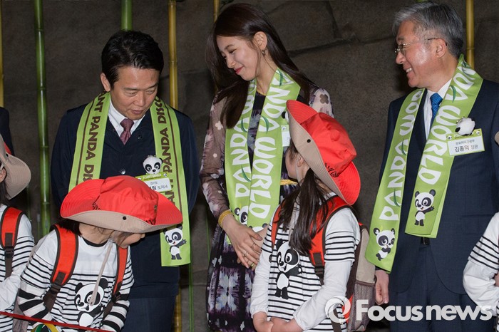 (용인=포커스뉴스) 21일 오전 경기도 용인시 에버랜드에서 열린 '판다월드 개관식'에서 남경필 경기도지사가 어린이에게 미쓰에이 수지를 소개하자 인사를 하고 있다.