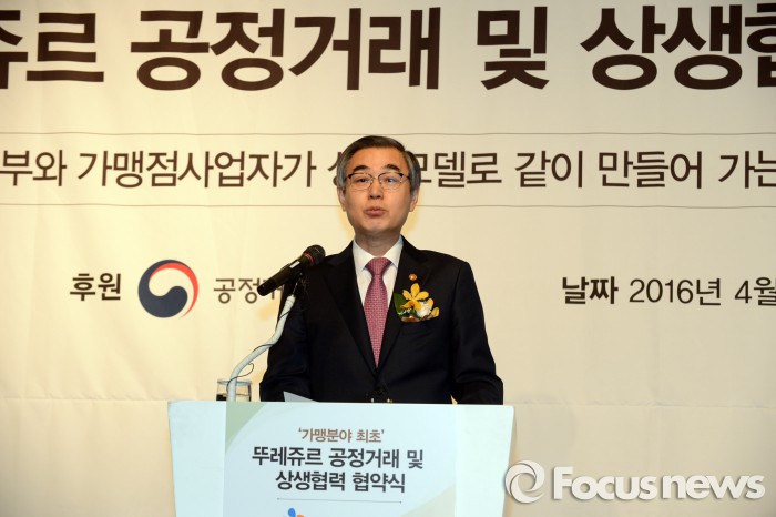 (서울=포커스뉴스) 21일 정재찬 공정거래위원장이 라마다 서울호텔에서 열린 CJ푸드빌·뚜레쥬르의 공정거래협약 체결식에 참석해 축사를 하고 있다. 이날 행사에서는 CJ푸드빌과 김창완 뚜레쥬르 역곡역남부점 대표 등 307개 가맹점주들이 공정거래와 상생을 약속하는 협약을 맺었다.<사진출처=공정거래위원회>