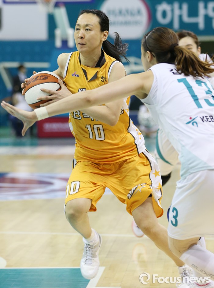 KB스타즈는 WKBL 2016~2017시즌 청주 홈 개막경기에서 변연하의 공식 은퇴식을 진행한다. 변연하의 지도자 연수도 지원한다.(부천=포커스뉴스) 6일 부천체육관에서 열린 2015-2016 여자프로농구 정규리그 마지막 경기 KEB하나은행-KB스타즈 경기에서 KB스타즈 변연하가 KEB하나 김정은을 제치며 골밑을 향해 대시하고 있다. 2016.03.06 우정식 기자
