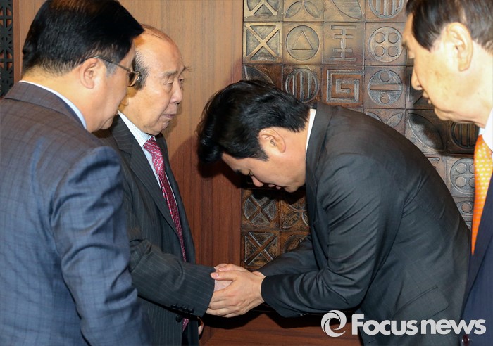 (서울=포커스뉴스) 원유철(오른쪽 두번째) 새누리당 원내대표와 김수한(왼쪽 두번째) 전 국회의장이 21일 오후 서울 여의도 LG트윈타워의 한 중식당에서 상임고문단 오찬회에 참석해, 악수하고 있다.