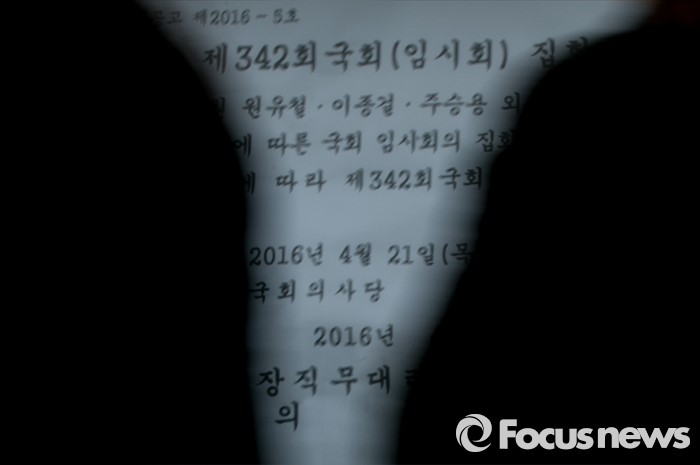 (서울=포커스뉴스) 21일 오후 서울 여의도 국회 앞 게시판에 19대 마지막 임시국회를 알리는 공고가 게시되어 있다.