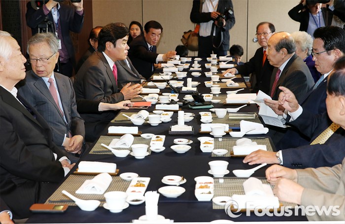 (서울=포커스뉴스) 원유철(왼쪽 세번째) 새누리당 원내대표가 21일 오후 서울 여의도 LG트윈타워의 한 중식당에서 상임고문단 오찬회에 참석해, 김수한(오른쪽 세번째) 전 국회의장과 대화하고 있다.