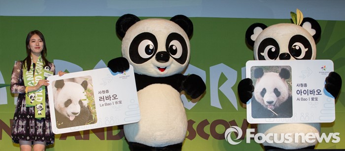 (용인=포커스뉴스) 21일 오전 경기도 용인시 에버랜드에서 열린 '판다월드 개관식'에서 미쓰에이 수지가 러바오, 아이바오 팬더 캐릭터 인형들과 기념촬영을 하고 있다.
