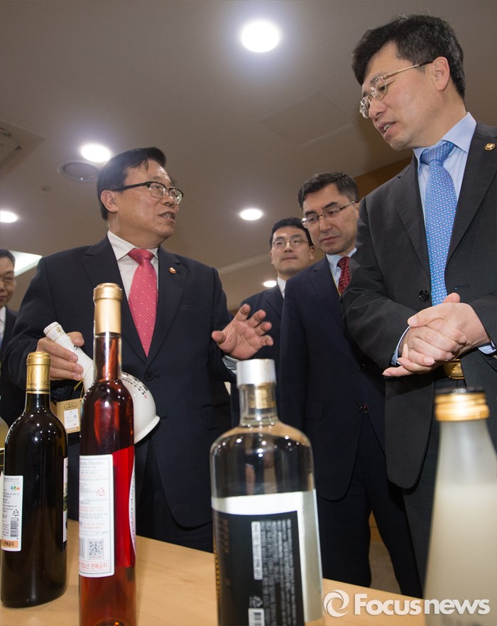 (세종=포커스뉴스) 이동필 농림축산식품부장관이 21일 오전 세종시 종부세종청사 농식품부 대회의실에서 나라장터 종합쇼핑몰의 전통주 판매 활성화를 지원하기 위한 업무협약을 체결하고 전통주에 대해 정양호 조달청장에게 설명하고 있다.